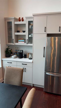 This modern kitchen is sleek and stylish, featuring clean-lined cabinetry, bold black accents, and a striking quartz island that doubles as a dining hub. Natural light pours through floor-to-ceiling windows, highlighting the rich wood floors and stainless steel finishes for a crisp, contemporary look.